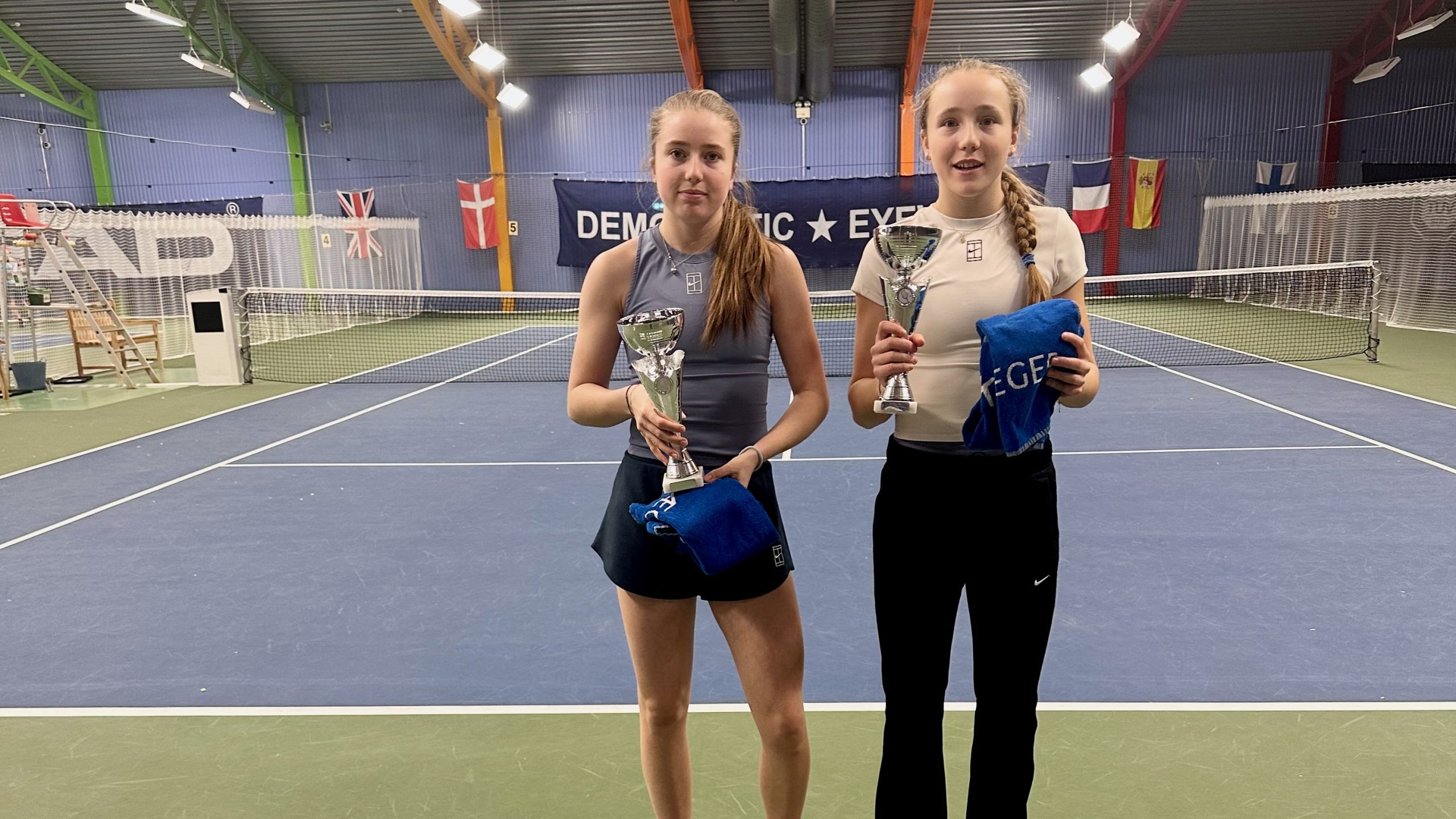 Vi gratulerar Matilda Kasselstrand (Westerviks TRK, till höger på bilden) som tillsammans med finskan Pihla Jouhten från Finland vann dubbeltiteln i Tennis Europetävlingen Ullevi Tennis Open (U14) i Göteborg. I finalen besegrades Bianca Fagerlund (Näsbyparks TK) och Tina Jansone från Lettland.