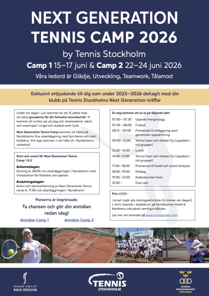 Det är hög tid att anmäla sig till Next Generation Tennis Camp 2026! Dessa camps är för dig som under det senaste året deltagit på någon av våra Next Generation-träffar. Ännu finns några platser kvar, så passa på att boka din plats redan idag!