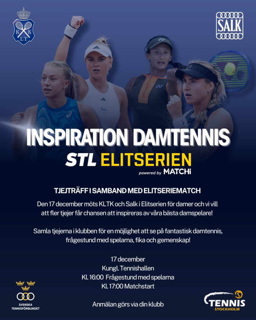 Vi hoppas många klubbar ser möjligheten att samla sina tjejer/damer till en inspirationsdag då KLTK – SALK drabbar samman i en spännande Elitseriematch. Förutom möjlighet att se högklassig damtennis kommer det också erbjudas möjlighet till en frågestund med spelarna.