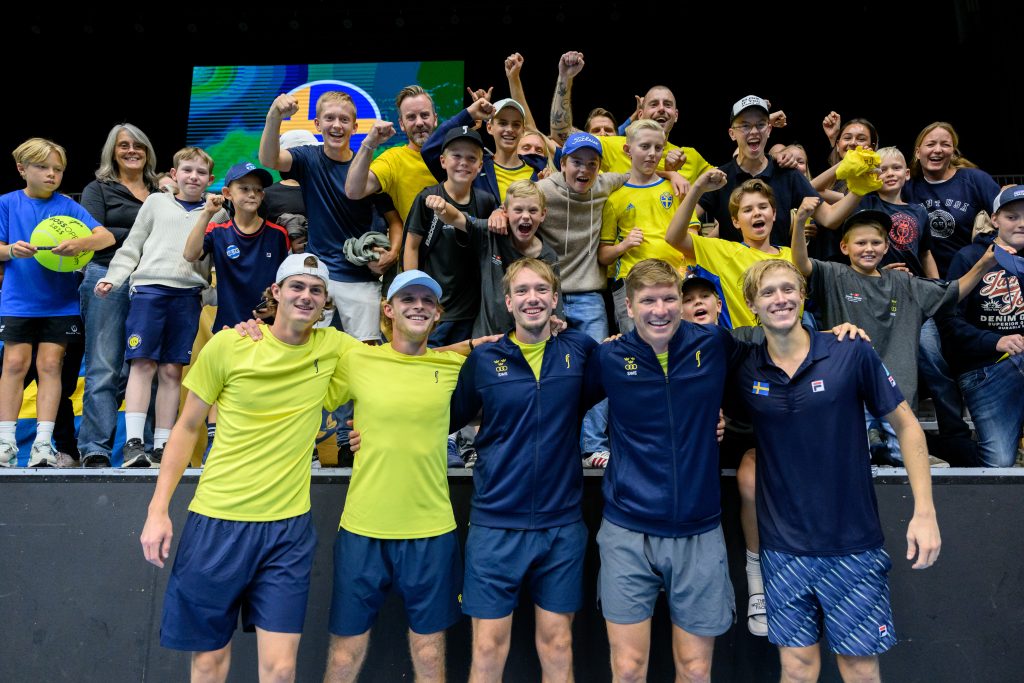 Svenska Davis Cup-laget med fansen från Kungsbacka TK efter vinsten i Partille Arena senast. Foto: Carl Sandin / Bildbyrån