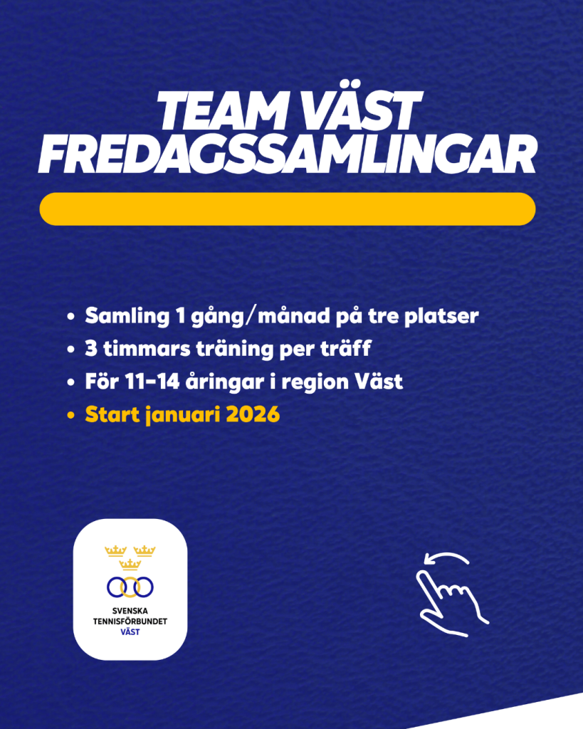 Team Väst 2026 innebär fredagsträffar en gång per månad på tre olika ställen i regionen för åldrarna 11-14 år. På varje ställe finns det en 11-12-årsgrupp och en 13-14-årsgrupp med en ansvarig tränare per grupp. Team Väst riktar sig till de juniorer i åldrarna 11-14 år som tävlar regelbundet och tillhör en klubb inom regionen. Syftet med att erbjuda extraträning för våra tävlingsspelare är att öka sammanhållning, träningsmängd, tävlingsspel på ett kul och lärorikt sätt. Skulle det vara få anmälda till något ställe kan grupperna komma att slås ihop så att 11-12-åringarna och 13-14-åringarna är med i samma grupp.